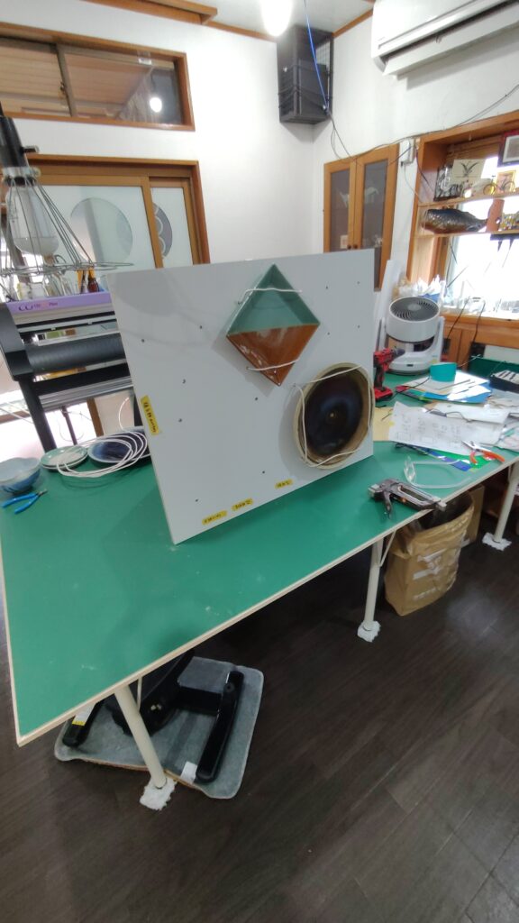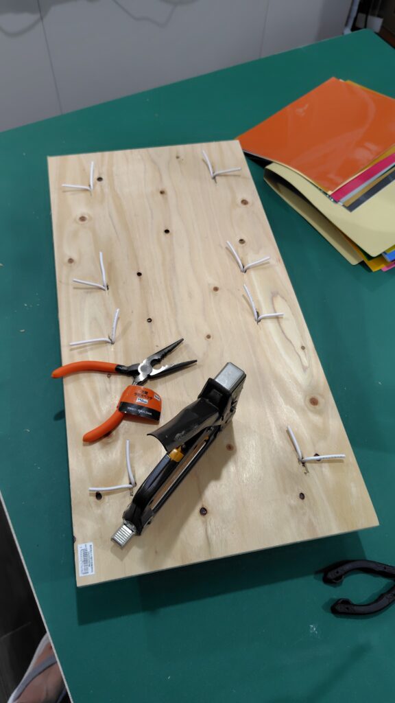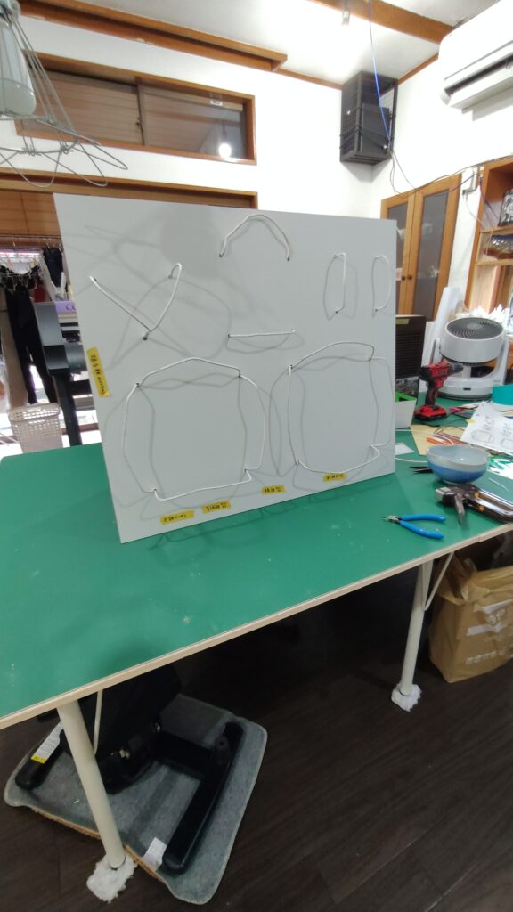 カットしてもらった板に、お皿1枚1枚固定できるワイヤーを、穴をあけて固定していく。